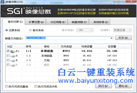 2、然后選擇備份還原里面的還原系統(tǒng)的選擇,再查看映像文件路徑是否正確,如果正確就點(diǎn)擊執(zhí)行。如果不正確就點(diǎn)擊打開,然后選擇到D盤根目錄你下載的系統(tǒng)文件,然后再點(diǎn)執(zhí)行。