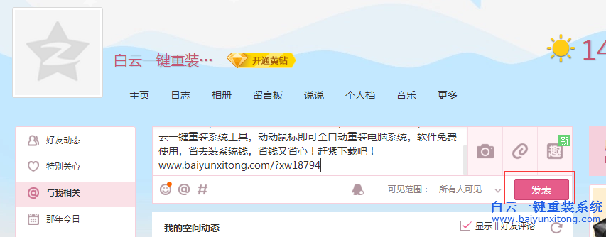 5、點(diǎn)擊復(fù)制連接之后,我們隨便找一個(gè)論壇,不論你是回帖,發(fā)帖,評(píng)論都可以,將復(fù)制的文字和連接發(fā)上去。比如白云現(xiàn)在用QQ空間發(fā)說(shuō)說(shuō)。