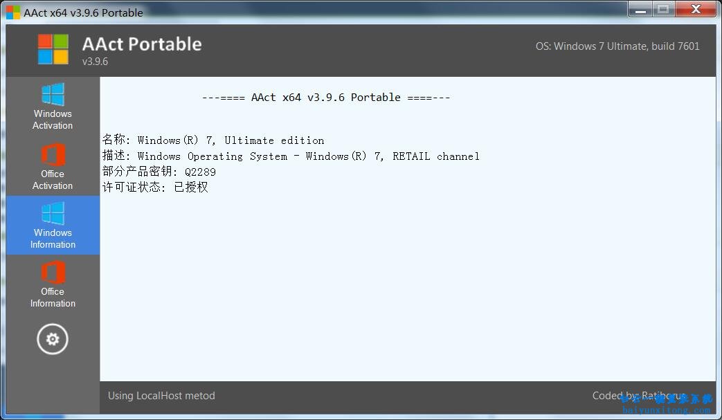 AAct V3.91功能特性支持Windows、Office 零售版及批量授權版KMS激活;不需任何版本的 .NET Framework 框架支持,可以激活Windows Vista、Windows 7、Windows 8/8.1、Windows 10、Server 2008/2008 R2、2012/2012 R2、Office 2010/2013/2016 VL 版本。此外,您還可在 Windows XP 上激活 Office 2010 VL。額外的啟動參數(shù):