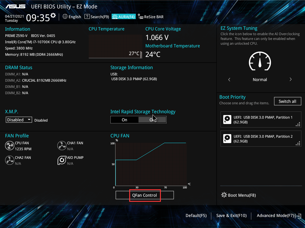 我們可以 通過BIOS中的EZ mode中QFAN CONTROL中設置CPU風扇轉速,但是有些用戶不知道怎么設