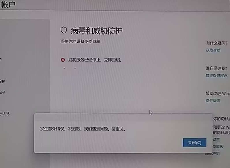 Win11打開Windows安全中心病毒防護時提示威脅服務已停止,立即重啟并有彈窗提示發生意